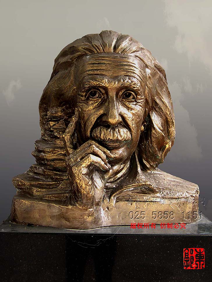 雕塑作品是雕塑家個人內心的情感和表達欲望情感的載體、宣揚精神層面的介質。愛因斯坦的雕塑塑造的是智慧與仁義的結合,他的人生在不斷探索、思考中感染著人類。藝術家索取的就是愛因斯坦散發(fā)出的人格魅力,他是世界的公民,他的愛建立在人道主義情懷之上,不屬于哪一個國度,藝術家無需精雕細琢,不是色彩的感覺,是內蘊情感的流露,猶如匕首刺向偽君子的面具,真實的面對生活,從事嚴謹?shù)目茖W研究。那是什么樣的文化孕育出世紀的偉人,是什么樣的審美心理塑造出的永恒。